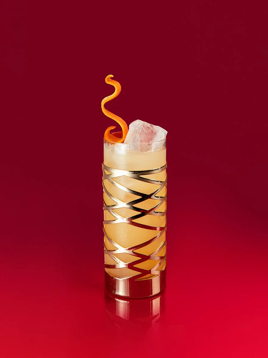 Strain lovingly into glass over ice. Carefully top off with the Grenadine. Garnish with Orange Peel.